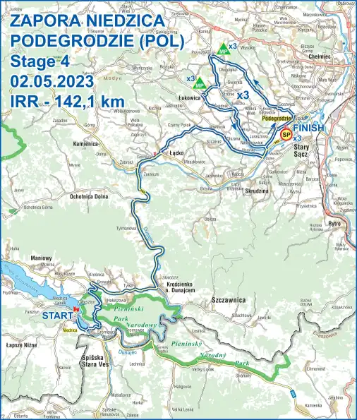 (START) Niedzica Zamek – Sromowce Niżne – Krośnica – Grywałd – Krościenko nad Dunajcem – Tylmanowa – Zabrzeż – Czerniec – Łącko – Czarny Potok – Olszana – Olszanka – Naszacowice – Podegrodzie, a następnie trzy pętle na trasie: Stadła – Gostwica – Długołęka Świerkla – Przyszowa – Łukowica – Świdnik – Owieczka – Rogi – Naszacowice – Podegrodzie (META).