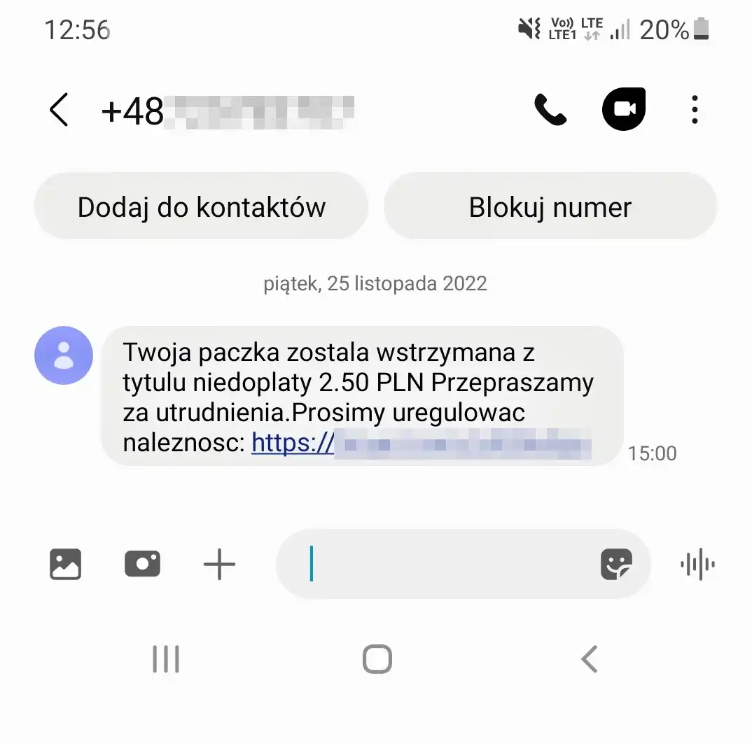 Smsy i e-maile od oszustów bardzo często zawierają również informacje o wstrzymaniu wysyłki paczki z powodu niedopłaty lub o innych drobnych problemach, które można łatwo rozwiązać przez wpłatę niewielkiej sumy pieniędzy. W takiej wiadomości dla „wygody klienta” przesyłany jest link do fałszywej strony internetowej, która jest łudząco podobna do autentycznej strony banku. Kiedy zalogujemy się w takiej witrynie przestępcy uzyskują dane, które później wykorzystują w celu wyłudzenia pieniędzy.