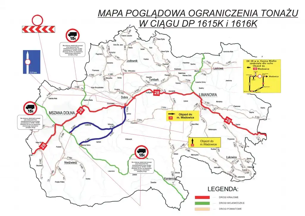 W związku ze wzmożonym ruchem samochodów ciężarowym na drogach powiatowych nr 1616K relacji Mszana Górna – Podłopień (na odcinku od drogi wojewódzkiej nr 968 w miejscowości Mszana Górna poprzez Łostówkę, Wilczyce, Jurków i Dobrą do skrzyżowania z drogą krajową 28) oraz 1615K Mszana Górna – Wilczyce i odwrotnie, spowodowanym zamknięciem przez GDDKiA odcinka DK 28 w m. Dobra / Kasina Wielka w wyniku zaistniałego osuwiska w miejscowości Kasina Wielka, pomimo wyznaczenia przez GDDKiA odjazdu drogami wojewódzkimi na trasie Limanowa- Bochnia- Myślenice- Wadowice i odwrotnie, Powiatowy Zarząd Dróg w Limanowej uprzejmie informuje, że od dnia 15.11.2023 r. został wprowadzony na w/w drogach powiatowych ograniczony ruch dla pojazdów ciężarowych, których dopuszczalna masa całkowita przekracza 15 ton. Ograniczenie w przejezdności podyktowane jest dbałością o stan techniczny nowo wyremontowanych dróg, zapewnienie bezpieczeństwa mieszkańców i będzie obowiązywało do czasu przywrócenia przejezdności na drodze krajowej.