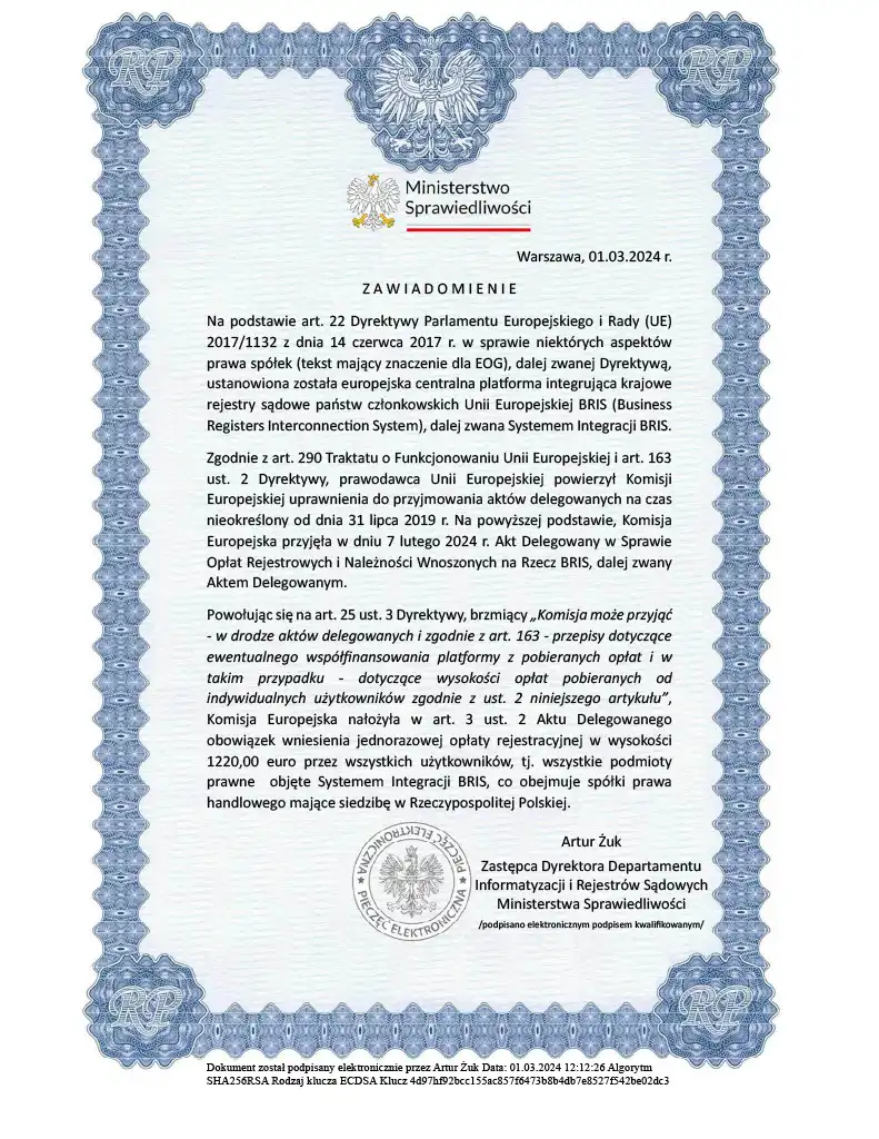 Cyberprzestępcy przesyłają wezwanie do zapłaty z wprowadzającej w błąd domeny: ministerstwo-sprawiedliwosci.com. Domagają się w nim zapłaty 1220 euro za rzekomy wpis podmiotu gospodarczego do systemu integracji rejestrów przedsiębiorstw BRIS.