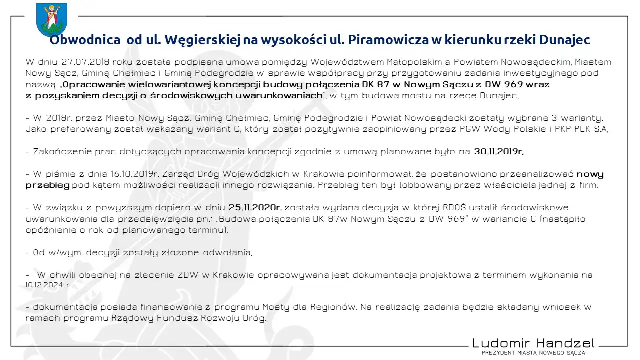 - obwodnica od ul. Węgierskiej na wysokości ul. Piramowicza w kierunku rzeki Dunajec