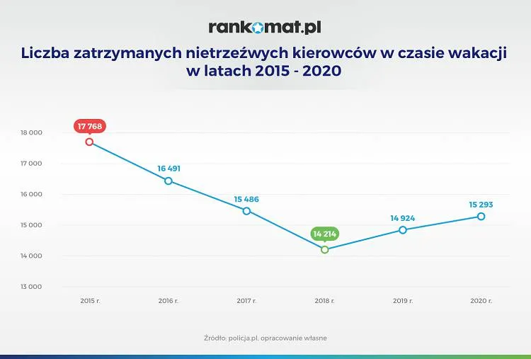 Od 2015 do 2018 roku liczba zatrzymanych w czasie wakacji kierowców pod wpływem alkoholu zmniejszała się z 17 768 takich przypadków do 14 214. Jednak w zeszłym roku liczba nietrzeźwych osób za kierownicą wzrosła do 14 924, a w tym roku do 15 293 zatrzymanych.