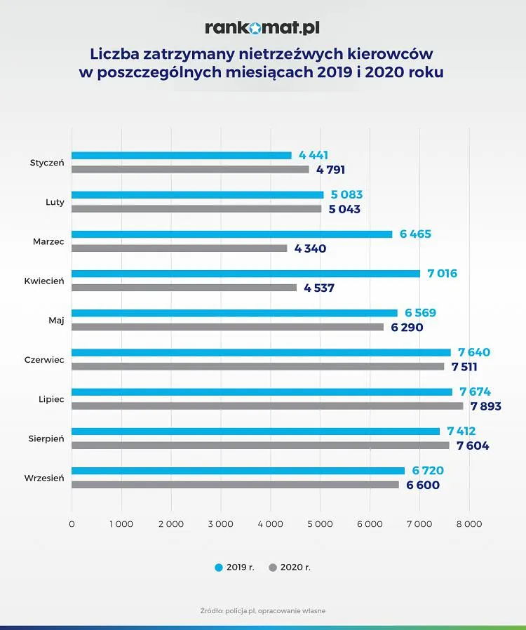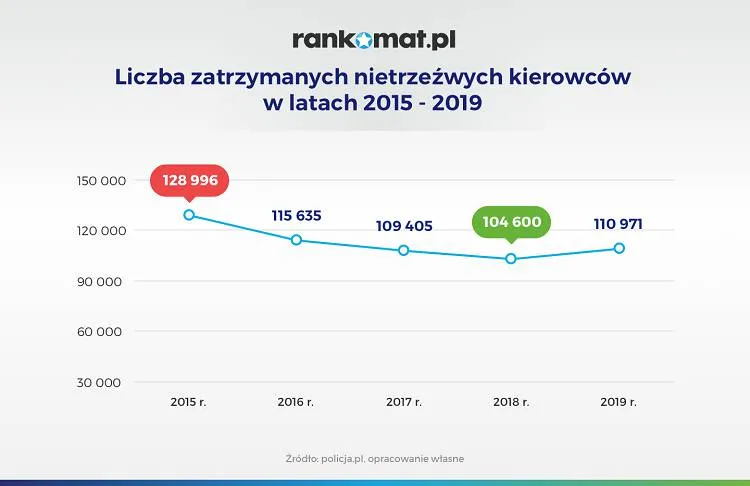 Biorąc pod uwagę sytuację w skali całego roku, obserwujemy podobną tendencję. W 2015 policja zatrzymała 128 996 nietrzeźwych kierowców. Do 2018 roku liczba ta spadła do 104 600 zatrzymanych. Jednak w zeszłym roku wzrosła do 110 971.