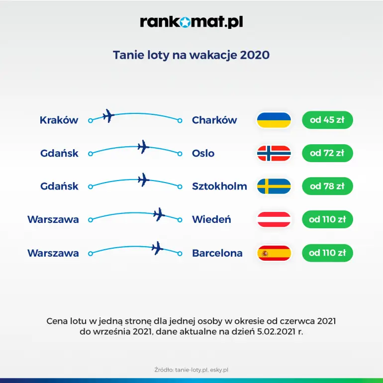 Najtaniej można kupić bilety lotnicze na Ukrainę - przykładowo połączenie z krakowskich Balic do Charkowa kosztuje zaledwie 45 zł. Do tanich kierunków można zaliczyć również Skandynawię - loty do Oslo i Sztokholmu z Gdańska można znaleźć poniżej 100 zł. Za 110 zł można polecieć z Warszawy do Barcelony oraz Wiednia.