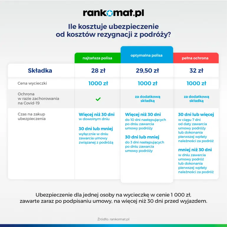 Ochroną można objąć bilety, noclegi na wyjazdy i wydarzenia, jak również całe wycieczki. Trzeba jednak pamiętać, że ubezpieczenie tego typu musi być zakupione odpowiednio wcześniej - najlepiej od razu po dokonaniu pierwszej wpłaty za bilet czy wyjazd - mówi Robert Pelczar, ekspert ds. ubezpieczeń turystycznych w rankomat.pl - Cena polisy ustalana jest w oparciu o koszt podróży. Przykładowo, wycieczkę o wartości 1000 zł można ubezpieczyć już od 28 zł - dodaje.