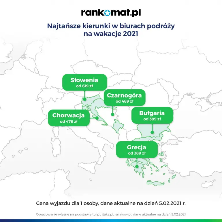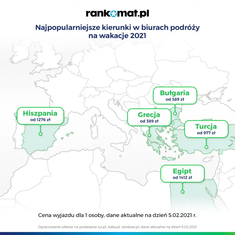 Eksperci prognozują, że tegoroczne wakacje będą już podobne do tych, które znamy z poprzednich lat, choć nie obejdzie się bez reżimu sanitarnego, zachowywania dystansu czy nawet konieczności przedstawienia tzw. paszportu medycznego, czyli zaświadczenia o zaszczepieniu. Dlatego eksperci rankomat.pl przeanalizowali oferty największych polskich biur podroży - Itaki, Tui oraz Ranibow. Sprawdzili ceny i popularność poszczególnych kierunków oraz przyjrzeli się ofertom linii lotniczych na wiosnę i lato 2021.