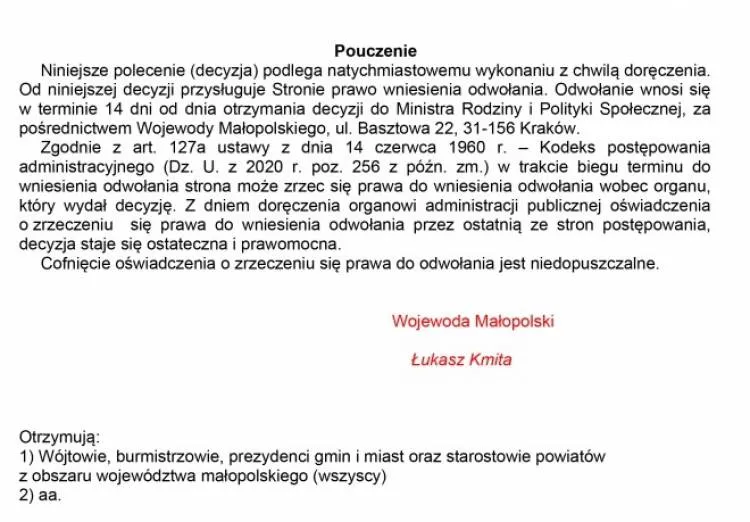 Wojewoda Małopolski Łukasz Kmita uchylił decyzję z dnia 14 października br., skierowaną do wszystkich wójtów, burmistrzów, prezydentów gmin i miast oraz starostów powiatów z obszaru województwa małopolskiego, w sprawie zawieszenia działalności w placówkach dla osób starszych, środowiskowych domach samopomocy oraz warsztatach terapii zajęciowej na terenie całego województwa małopolskiego.