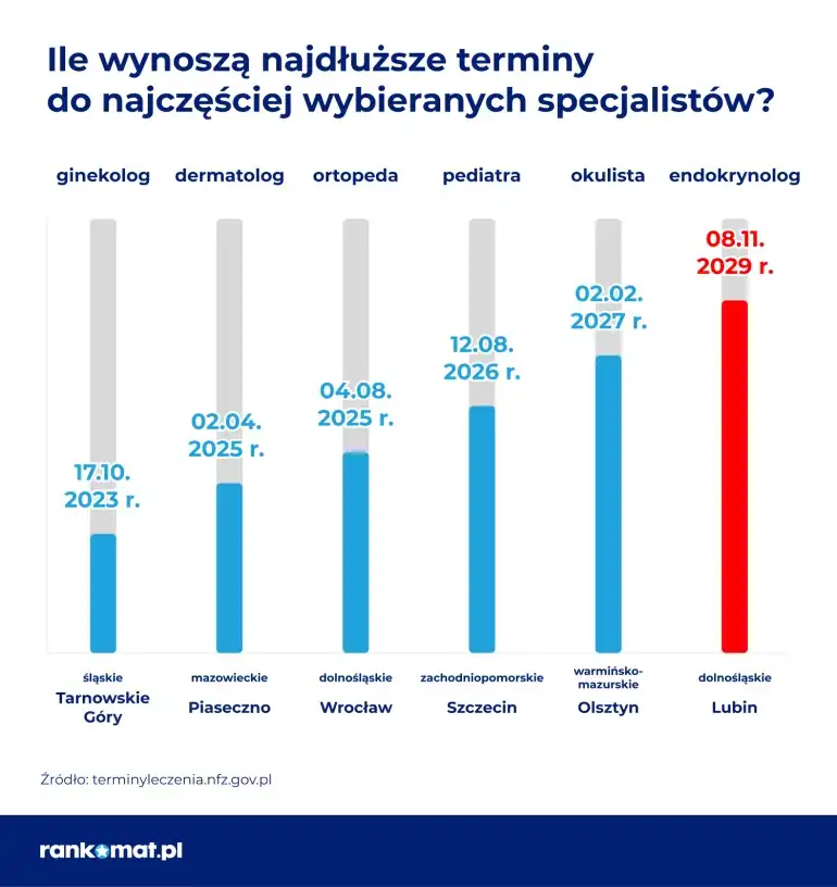 Informacje o dostępnych terminach publikuje portal terminyleczenia.nfz.gov.pl, a przedstawione poniżej dane dotyczą stanu z dnia 21.10.2022 r. Z zestawienia wynika, że w Tarnowskich Górach, w województwie śląskim maksymalny czas oczekiwania na wizytę u ginekologa wynosi 12 miesięcy (17.10.2023 r.), w Piasecznie (województwo mazowieckie) na dermatologa najdłużej możemy czekać niecałe 3 lata (02.04.2025 r.), podobnie sytuacja wygląda we Wrocławiu, jeśli zależałoby nam na wizycie u ortopedy (04.08.2025 r.). Maksymalny czas oczekiwania na spotkanie z pediatrą w Szczecinie wynosi prawie 4 lata (12.08.2026 r.), na okulistę w Olsztynie (warmińsko-mazurskie) możemy poczekać do 5 lat (02.02.2027 r.). Rekord dotyczy endokrynologa, na którego w Lubinie (dolnośląskie) najdłuższy termin przypada na 2029 rok (a dokładnie 08.11.2029 r.). Wizyty w przeciągu kilku dni lub tygodni oczywiście są możliwe, jednak są one zależne od tego, jakimi zasobami dysponują poszczególne przychodnie.