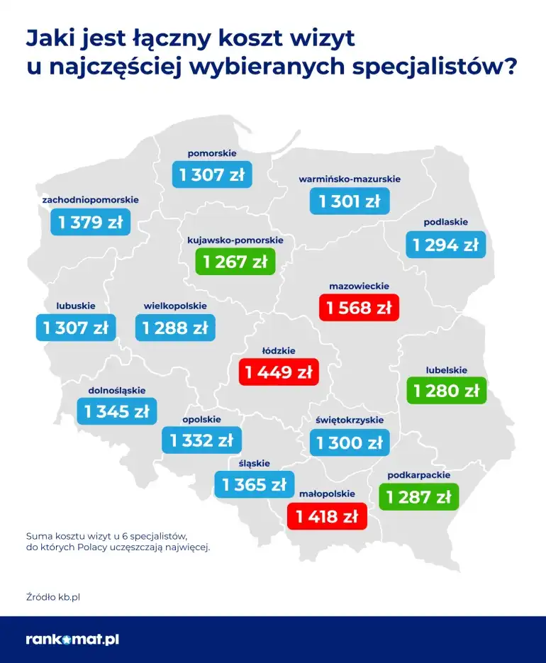 Z danych wynika, że najdroższe wizyty odbywają się w województwie mazowieckim. Dogo jest również na Śląsku, w Małopolsce, w województwie łódzkim oraz zachodniopomorskim.