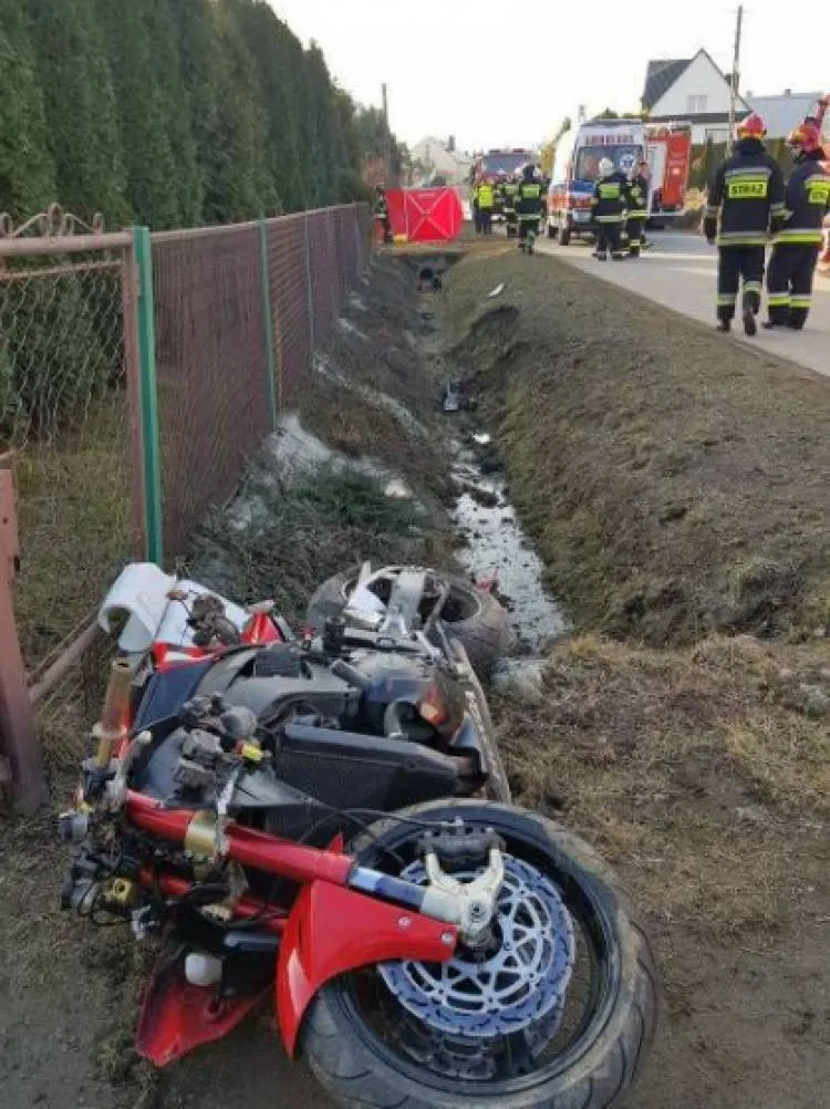 Motocyklista na łuku stracił panowanie nad pojazdem po czym wypadł z drogi i uderzył w betonowy przepust. Poszkodowany znajdował się w rowie bez oznak życia. Jego motocykl wylądował kilkanaście metrów dalej na następnym przepuście.