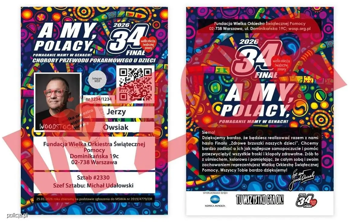 Policja przypomina, że każdy wolontariusz WOŚP musi posiadać widoczny identyfikator. Znajdują się na nim imię i nazwisko, numer wolontariusza zgodny z numerem umieszczonym na puszce, zdjęcie wolontariusza, dane sztabu, numer zbiórki, hologram potwierdzający oryginalność, pieczątka Fundacji WOŚP oraz kod QR. Wizerunek na zdjęciu powinien odpowiadać rzeczywistemu wyglądowi kwestującego, a identyfikator musi zawierać charakterystyczne serduszkowe logo Fundacji.