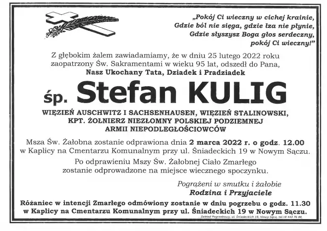 Uroczystości pogrzebowe kpt. Stefana Kuliga rozpoczną się 2 marca 2022 roku mszą świętą w Kaplicy przy ulicy Śniadeckich 19 na Cmentarzu Komunalnym w Nowym Sączu.